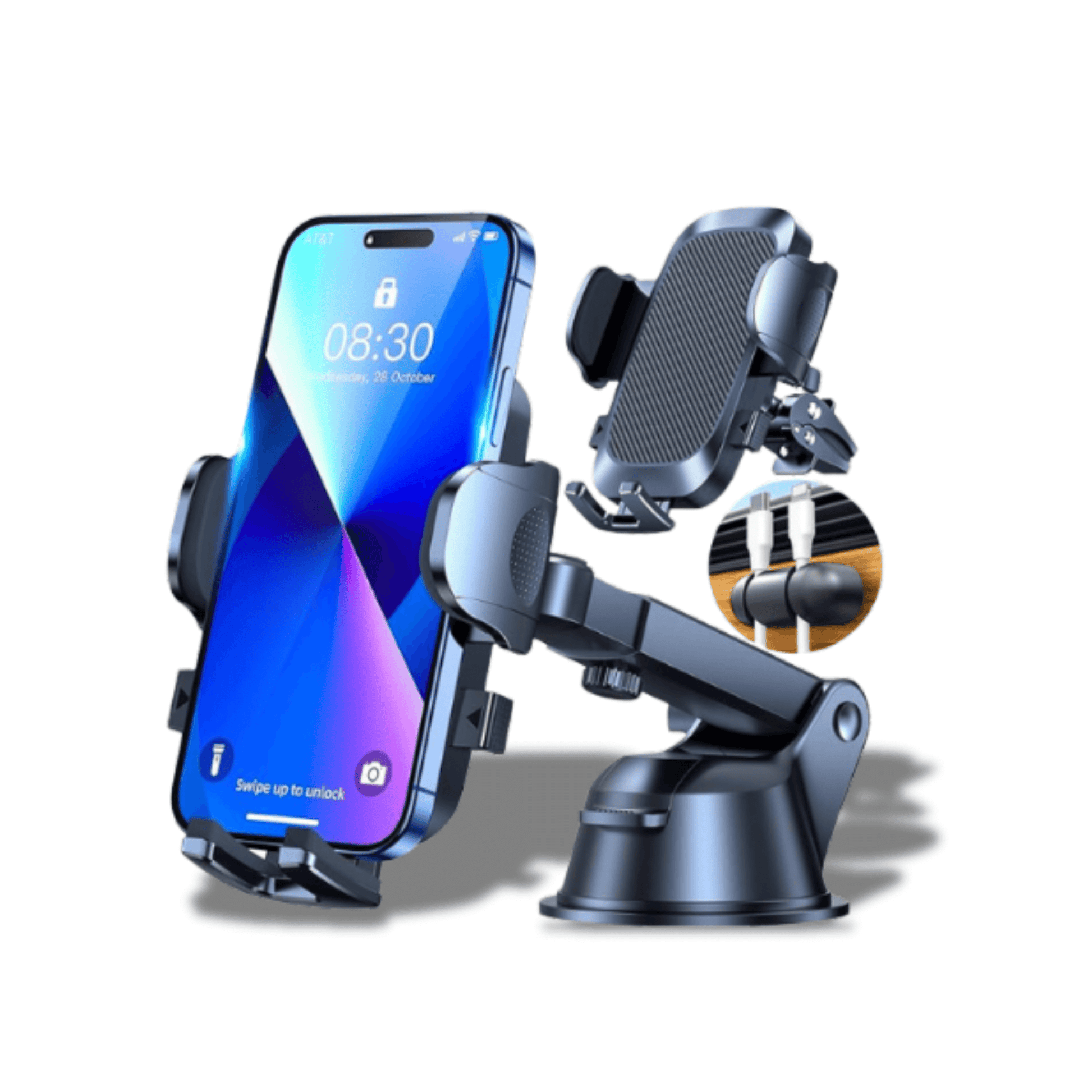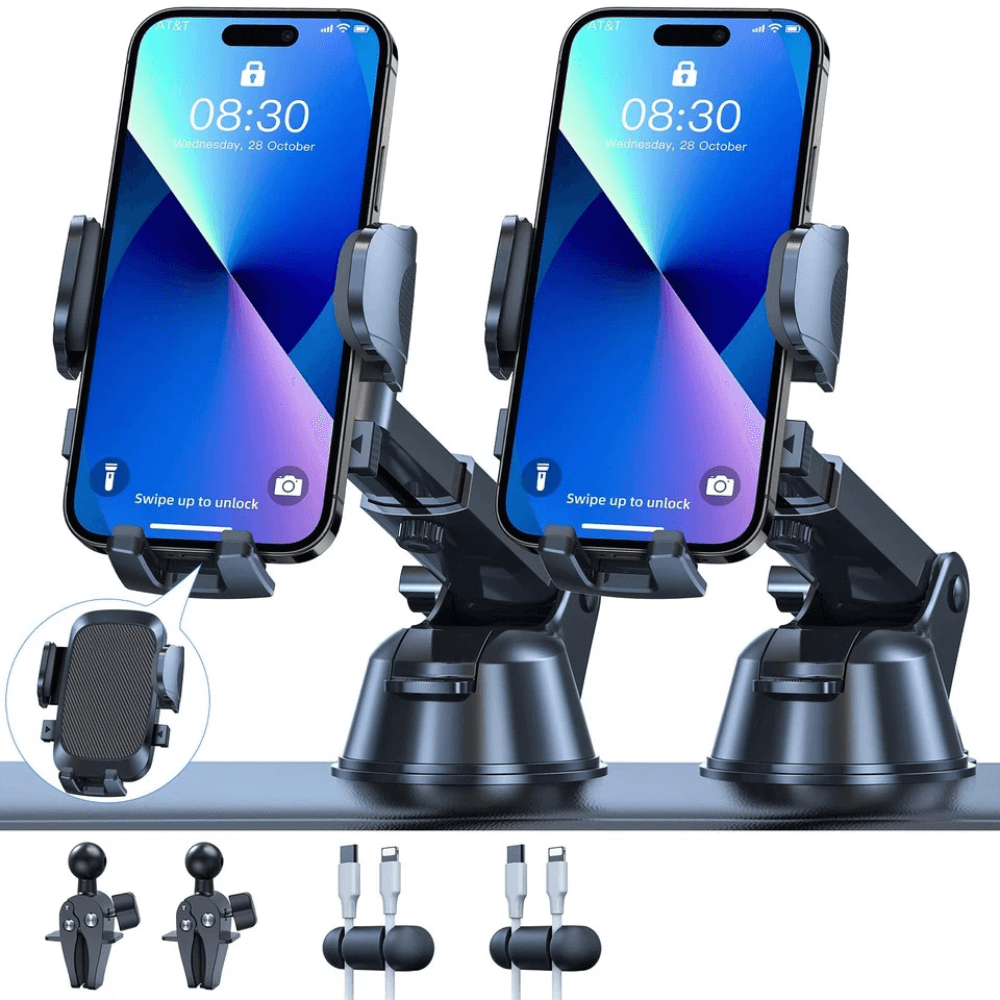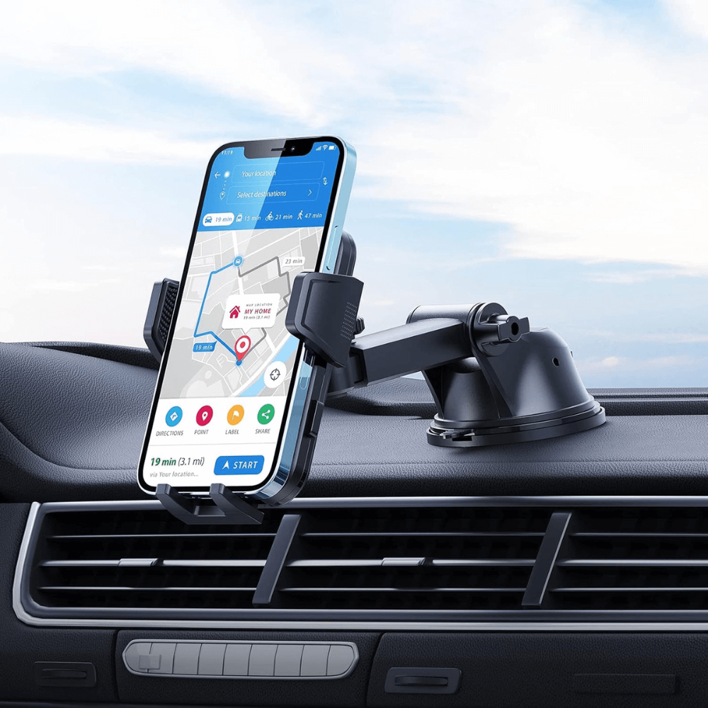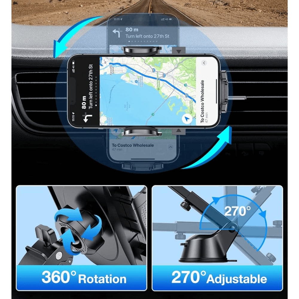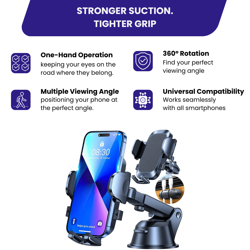 Drive stress-free with a sticky gel suction cup that grips dashboards or windshields like a pro.